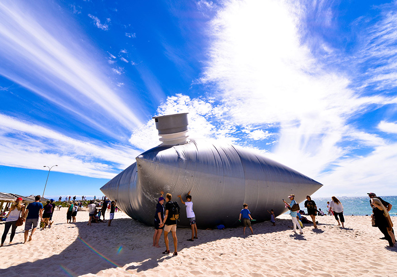 I watched an interview of Norton Flavel discussing this work, I must agree that I found his points about his work quite uninteresting. He says "it's about big things and it references ships, and you know all the stuff we carry around, baggage and" ..it sounds like it was a surprise interview as his thought do not appear collected to respond to what his work is actually about? It is a playful piece of work, but for me this idea of increasing that size of a well known object and thus taking it out of context has been done - and this work doesn't offer anything new to this conversation. I find that I really want it to be interactive, beyond the point that onlookers can photograph it - it looks as if it would be so fun to jump on.